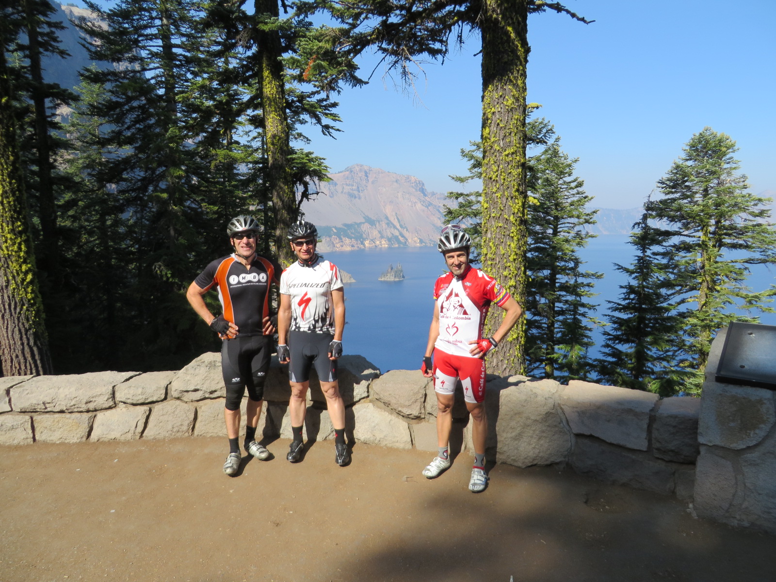 then continued our climb to Crater Lake. The climb was steady amongst the beautiful Oregon forest, and the weather was perfect, although we just missed a storm the day before as parts of the road had standing water and debris. The final road up to Mazama Campground was a steep 6 mile climb. Roobik picked up the pace and took the KOM, Julio followed while Hans’ knee began to give him trouble. We were pleasantly surprised that the campground had showers, and Natasha had picked a perfect campsite. For dinner we had veggie burgers, salad, and beans, and enjoyed true stories at 7200 feet elevation, our coldest night of the trip. That evening we attended the forest ranger’s amphitheater slide show on the history of Crater Lake, but walked out early to get to bed.