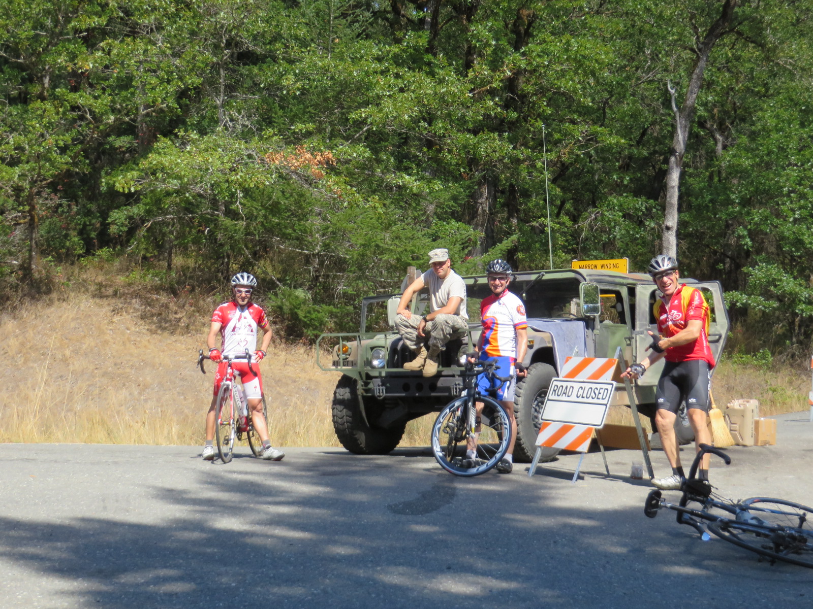 We woke up in our secluded campsite and broke down camp for the last time. Breakfast was pancakes and fruit, and our queen stage began. We rode along another beautiful, secluded road with good climbing and descents on Highway 33 that paralleled the Rogue River. Roobik was ready to put the hurt on us for the 5000 foot climb up Bear Creek Mountain, but after 35 miles of riding unbeknownst to us Hans had called out the National Guard to shut down the mountain due to a fire. They told us we could not proceed, unless we wanted to get shot.