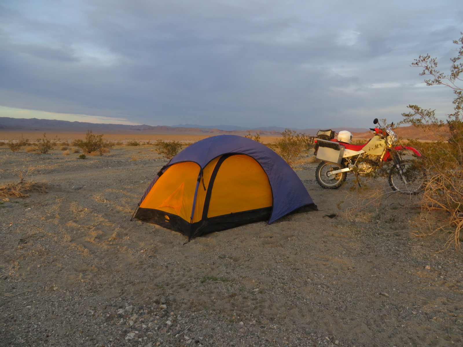 After 375 miles of riding I made it to Death Valley and the Mesquite Campground. It was 2:30. Ross and Mike were hanging around camp. I was really expecting to find a note that would read something like “Went for a ride, see you later”. It seemed they weren’t much in the mood for a ride and I was tired after the long ride so I set up camp and we relaxed.