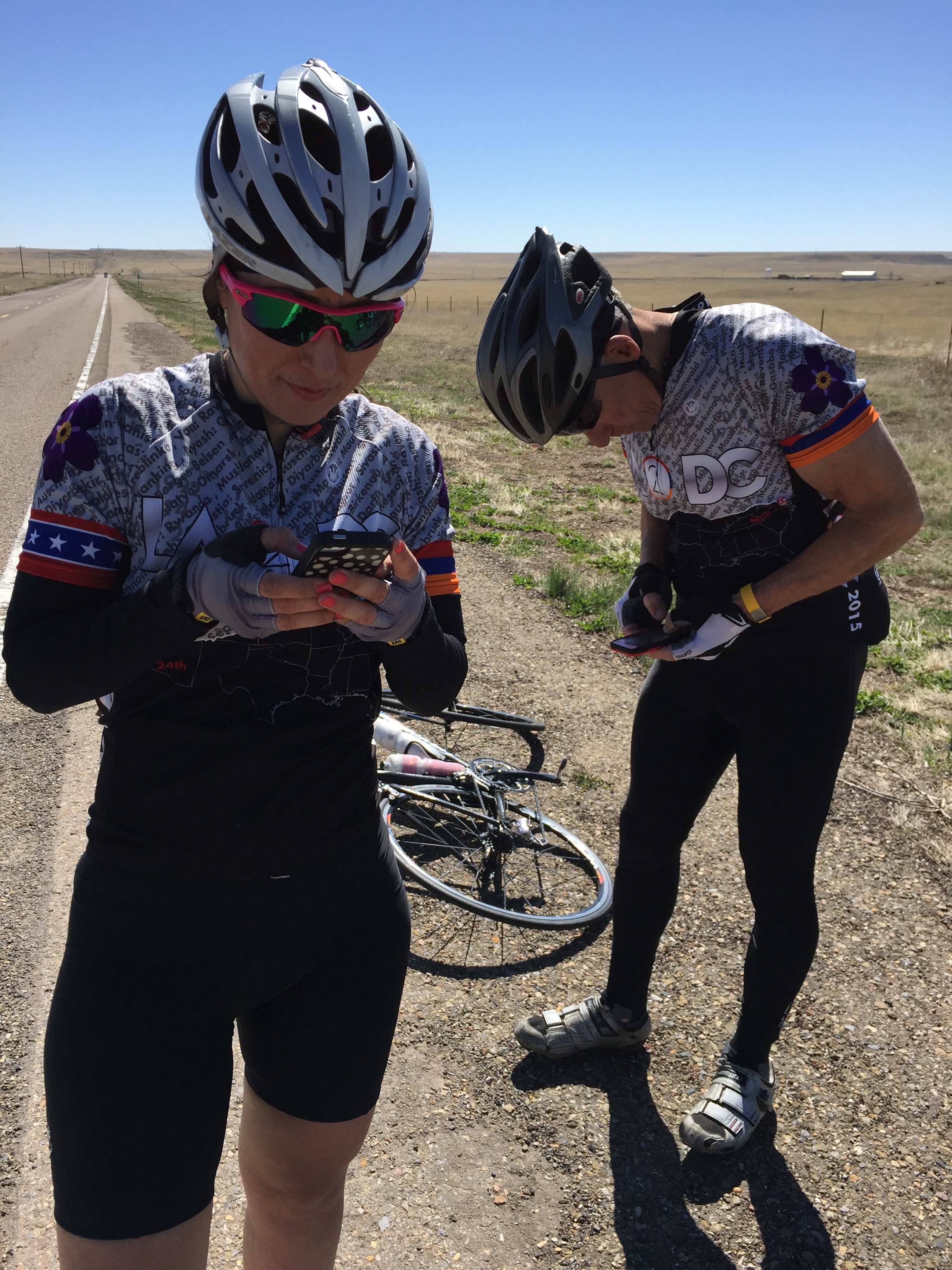 Vicken’s bead on his tire was not seated properly so we stopped to fix it. That gave Anush and I time for a quick Facebook update.